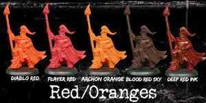 The set includes 21 Acrylics that are intedned to be mixed and matched for interesting tones, 3 grubby metallics, and 6 acrylic inks that can be added to other paints for shading or used as the basis for glowing effects.